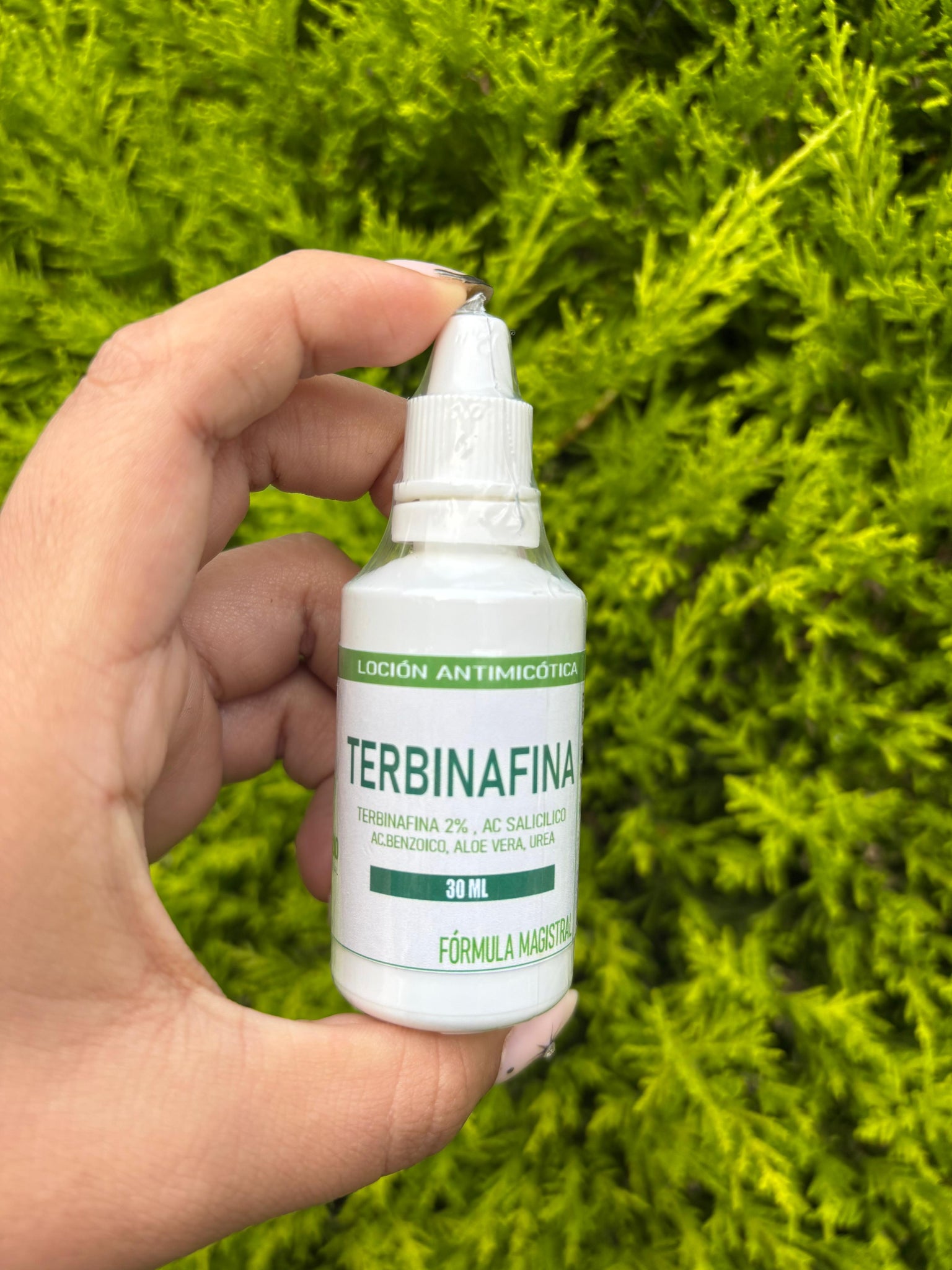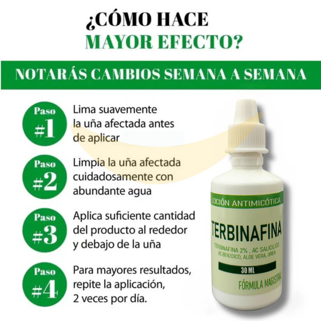 Cambios visibles desde la segunda semana de uso continuo. -Líquido de fácil aplicación y absorción. -Terbinafina 2% -Contenido 30 mL -Cantidad: alcanza hasta 1 mes.